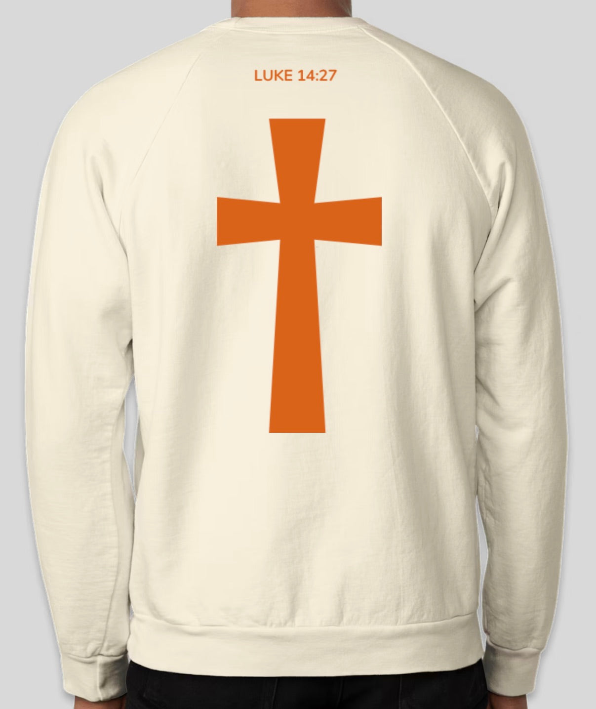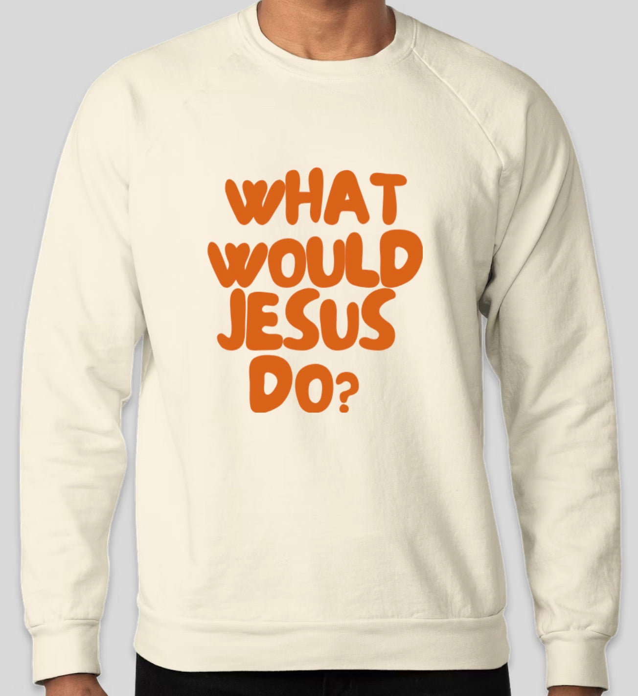 "What Would Jesus Do?" on the front of the sweatshirt. Luke 14:27 and a cross to carry on the back.
